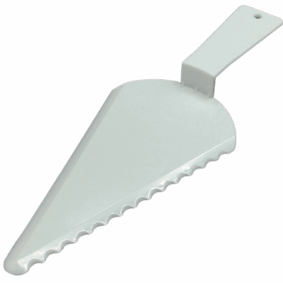 The LoTech Sales 9 inch Super Server is a practical and durable plastic utensil designed specifically for pizza. Its smart triangular shape makes cutting pizza slices quick and easy right in the box. The integrated low handle provides a comfortable grip for serving and also functions as a convenient box spacer, preventing the lid from sticking to your delicious toppings during delivery.